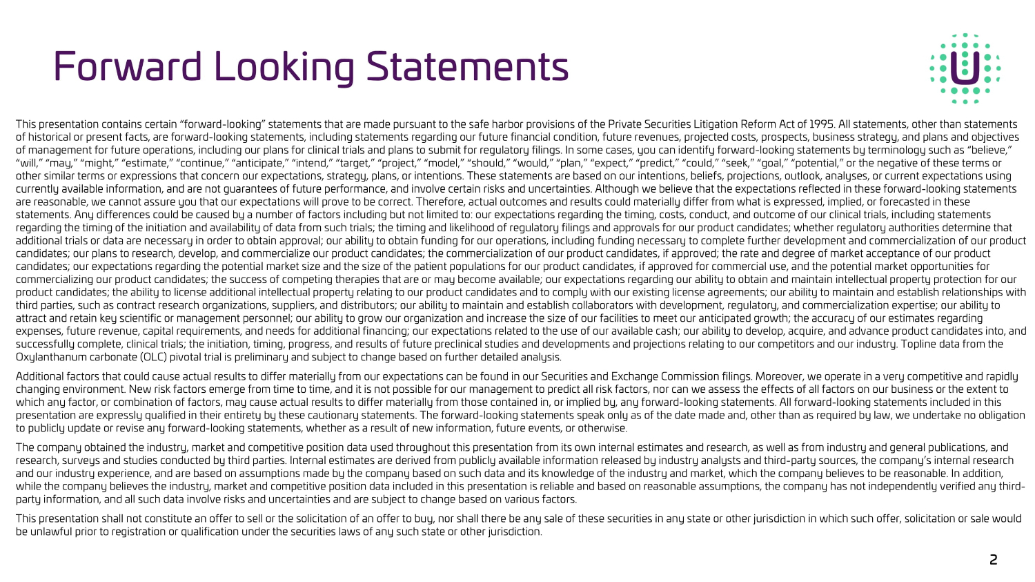 Forward Looking Statements This presentation contains certain “forward - looking” statements that are made pursuant to the safe harbor provisions of the Private Securities Litigation Reform Ac t of 1995. All statements, other than statements of historical or present facts, are forward - looking statements, including statements regarding our future financial condition, f uture revenues, projected costs, prospects, business strategy, and plans and objectives of management for future operations, including our plans for clinical trials and plans to submit for regulatory filings. In s ome cases, you can identify forward - looking statements by terminology such as “believe,” “will,” “may,” “might,” “estimate,” “continue,” “anticipate,” “intend,” “target,” “project,” “model,” “should,” “would,” “pla n,” “expect,” “predict,” “could,” “seek,” “goal,” “potential,” or the negative of these terms or other similar terms or expressions that concern our expectations, strategy, plans, or intentions. These statements are based on our intentions, beliefs, projections, outlook, analyses, or current expectations using currently available information, and are not guarantees of future performance, and involve certain risks and uncertainties. A lth ough we believe that the expectations reflected in these forward - looking statements are reasonable, we cannot assure you that our expectations will prove to be correct. Therefore, actual outcomes and results c oul d materially differ from what is expressed, implied, or forecasted in these statements. Any differences could be caused by a number of factors including but not limited to: our expectations regarding t he timing, costs, conduct, and outcome of our clinical trials, including statements regarding the timing of the initiation and availability of data from such trials; the timing and likelihood of regulatory fil ing s and approvals for our product candidates; whether regulatory authorities determine that additional trials or data are necessary in order to obtain approval; our ability to obtain funding for our operations, includ ing funding necessary to complete further development and commercialization of our product candidates; our plans to research, develop, and commercialize our product candidates; the commercialization of our product ca ndi dates, if approved; the rate and degree of market acceptance of our product candidates; our expectations regarding the potential market size and the size of the patient populations for our product cand ida tes, if approved for commercial use, and the potential market opportunities for commercializing our product candidates; the success of competing therapies that are or may become available; our expectations re garding our ability to obtain and maintain intellectual property protection for our product candidates; the ability to license additional intellectual property relating to our product candidates and to comply wit h our existing license agreements; our ability to maintain and establish relationships with third parties, such as contract research organizations, suppliers, and distributors; our ability to maintain and establish co lla borators with development, regulatory, and commercialization expertise; our ability to attract and retain key scientific or management personnel; our ability to grow our organization and increase the size of our fac ilities to meet our anticipated growth; the accuracy of our estimates regarding expenses, future revenue, capital requirements, and needs for additional financing; our expectations related to the use of ou r a vailable cash; our ability to develop, acquire, and advance product candidates into, and successfully complete, clinical trials; the initiation, timing, progress, and results of future preclinical studies and devel opm ents and projections relating to our competitors and our industry. Topline data from the Oxylanthanum carbonate (OLC) pivotal trial is preliminary and subject to change based on further detailed analysis. Additional factors that could cause actual results to differ materially from our expectations can be found in our Securities and Exchange Commission filings. Moreover, we operate in a very competitive and rapidly changing environment. New risk factors emerge from time to time, and it is not possible for our management to predict all ris k f actors, nor can we assess the effects of all factors on our business or the extent to which any factor, or combination of factors, may cause actual results to differ materially from those contained in, or implie d b y, any forward - looking statements. All forward - looking statements included in this presentation are expressly qualified in their entirety by these cautionary statements. The forward - looking statements speak only as of the date made and, other than as required by law, we undertake no obligation to publicly update or revise any forward - looking statements, whether as a result of new information, future events, or otherwise . The company obtained the industry, market and competitive position data used throughout this presentation from its own intern al estimates and research, as well as from industry and general publications, and research, surveys and studies conducted by third parties. Internal estimates are derived from publicly available information rel eased by industry analysts and third - party sources, the company’s internal research and our industry experience, and are based on assumptions made by the company based on such data and its knowledge of the ind ust ry and market, which the company believes to be reasonable. In addition, while the company believes the industry, market and competitive position data included in this presentation is reliable and b ase d on reasonable assumptions, the company has not independently verified any third - party information, and all such data involve risks and uncertainti