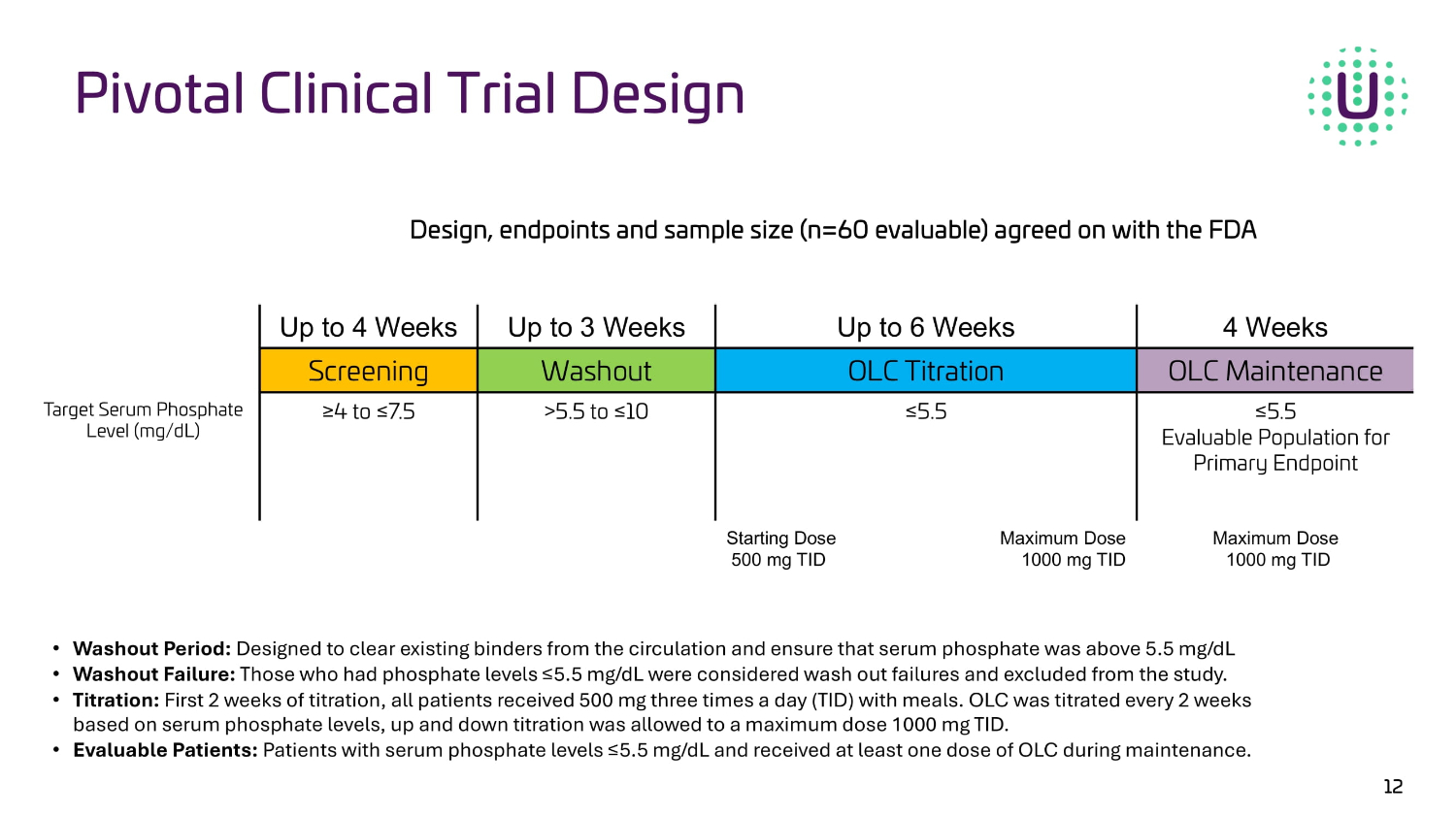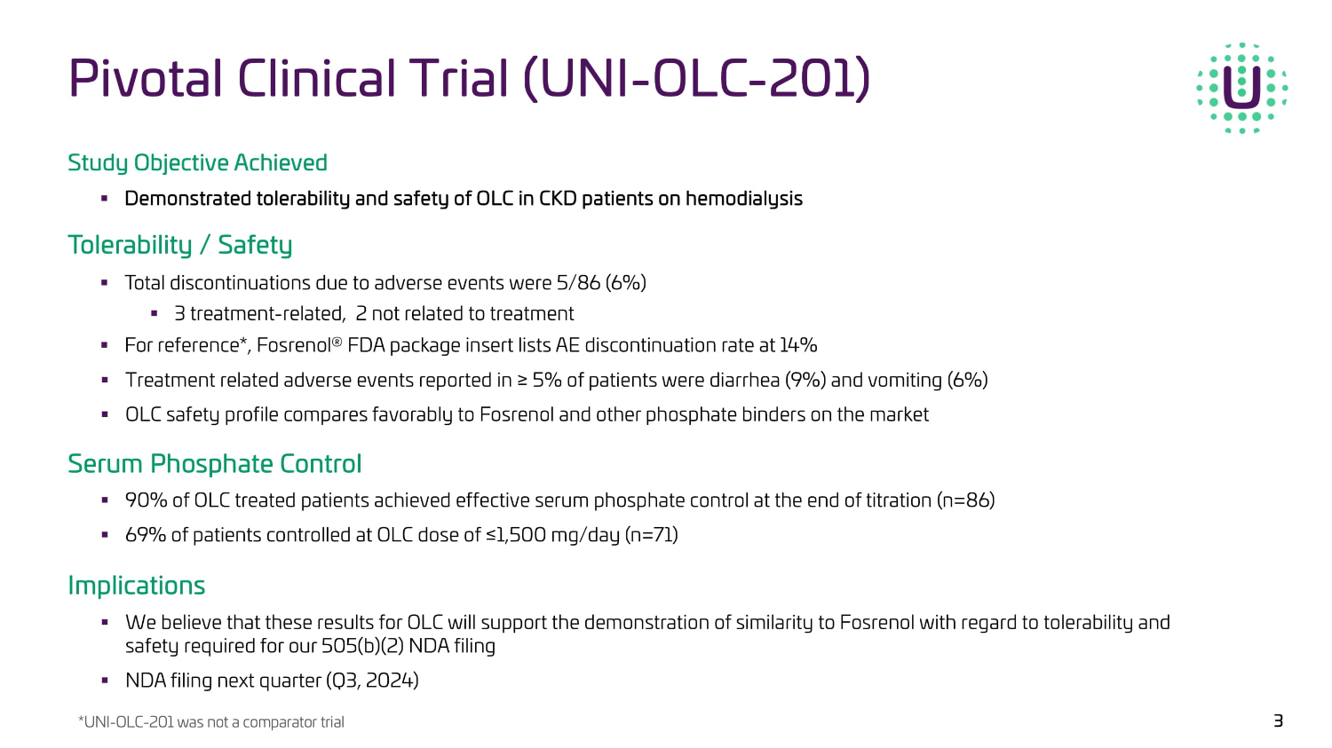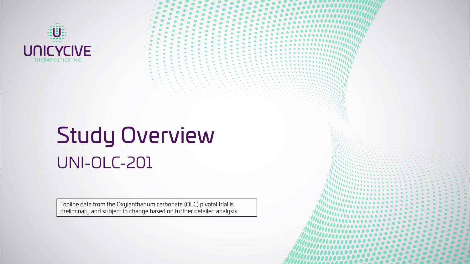 Study Overview UNI - OLC - 201 Topline data from the Oxylanthanum carbonate (OLC) pivotal trial is preliminary and subject to change based on further detailed analysis.