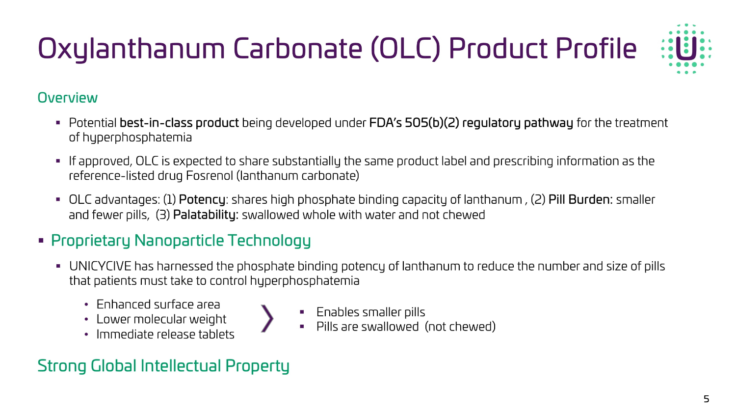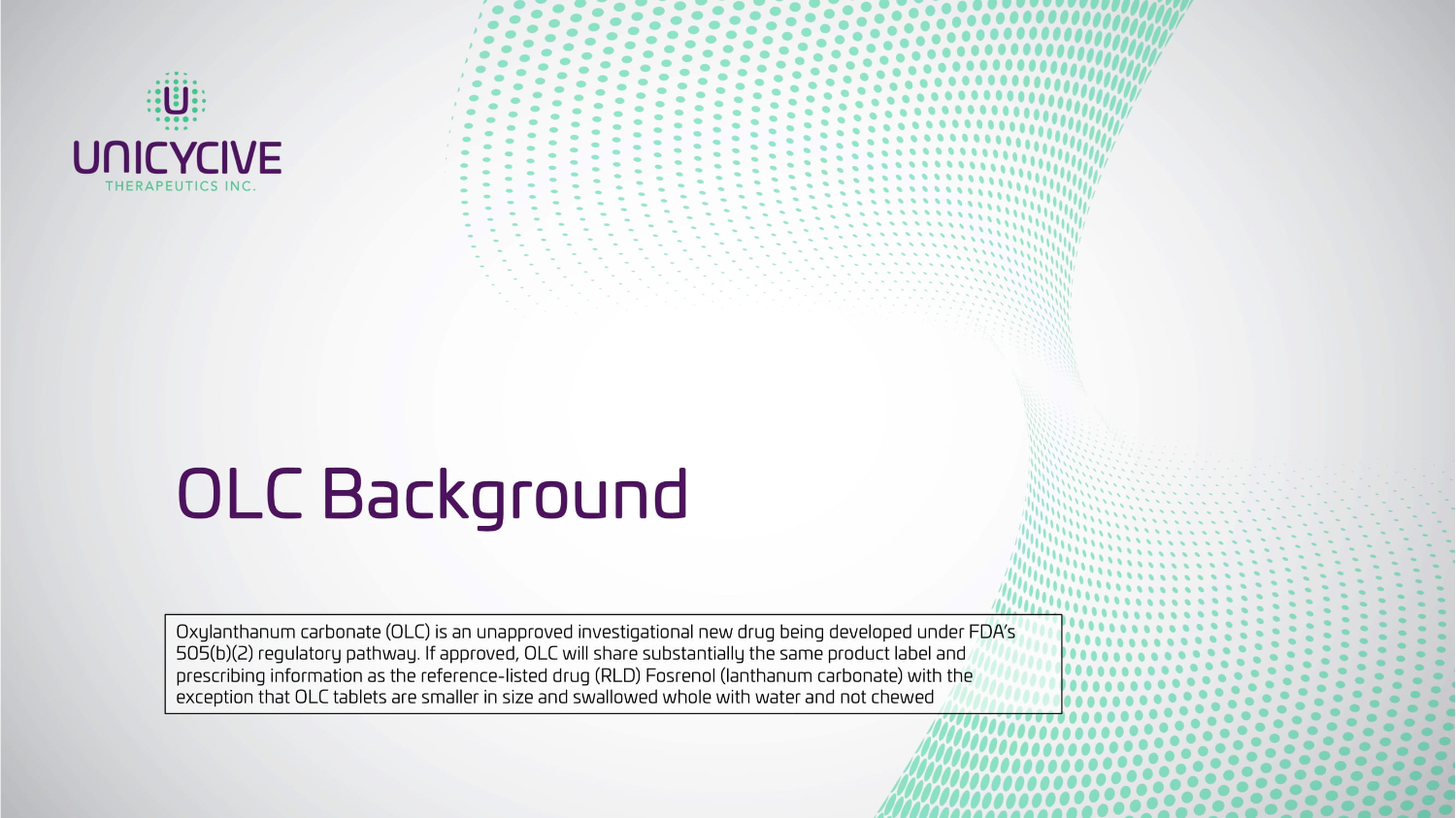Oxylanthanum carbonate (OLC) is an unapproved investigational new drug being developed under FDA’s 505(b)(2) regulatory pathway. If approved, OLC will share substantially the same product label and prescribing information as the reference - listed drug (RLD) Fosrenol (lanthanum carbonate) with the exception that OLC tablets are smaller in size and swallowed whole with water and not chewed OLC Background