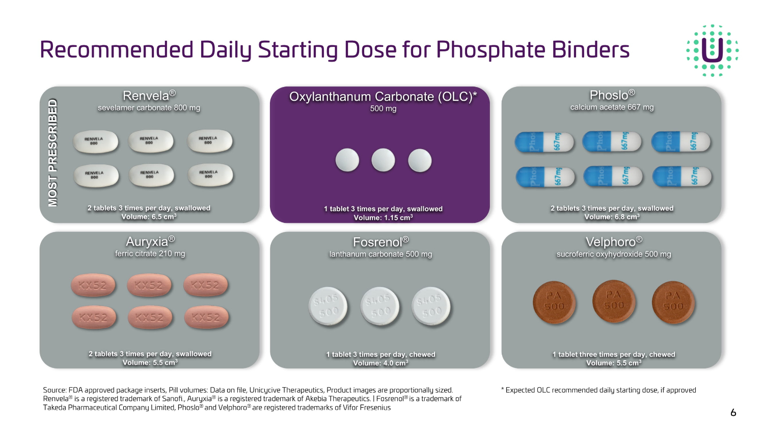 6RXUFH)'$DSSURYHGSDFNDJHLQVHUWV3LOOYROXPHV'DWDRQȅOH8QLF\FLYH7KHUDSHXWLFV3URGXFWLPDJHVDUHSURSRUWLRQDOO\V L]H G 5HQYHOD n LVDUHJLVWHUHGWUDGHPDUNRI6DQRȅ$XU\[LD n LVDUHJLVWHUHGWUDGHPDUNRI$NHELD7KHUDSHXWLFV_)RVUHQRO n LVDWUDGHPDUNRI 7DNHGD3KDUPDFHXWLFDO&RPSDQ\/LPLWHG3KRVOR n DQG9HOSKRUR n DUHUHJLVWHUHGWUDGHPDUNVRI9LIRU)UHVHQLXV Renvela ® sevelamer carbonate 800 mg 2 tablets 3 times per day, swallowed Volume: 6.5 cm 3 Phoslo ® calcium acetate 667 mg 2 tablets 3 times per day, swallowed Volume: 6.8 cm 3 Auryxia ® ferric citrate 210 mg 2 tablets 3 times per day, swallowed Volume: 5.5 cm 3 Velphoro ® sucroferric oxyhydroxide 500 mg 1 tablet three times per day, chewed Volume: 5.5 cm 3 Fosrenol ® lanthanum carbonate 500 mg 1 tablet 3 times per day, chewed Volume: 4.0 cm 3 Recommended Daily Starting Dose for Phosphate Binders MOST PRESCRIBED 2[\ODQWKDQXP&DUERQDWH2/& PJ WDEOHW WLPHVSHUGD\VZDOORZHG 9ROXPH FP 6 * Expected OLC recommended daily starting dose, if approved