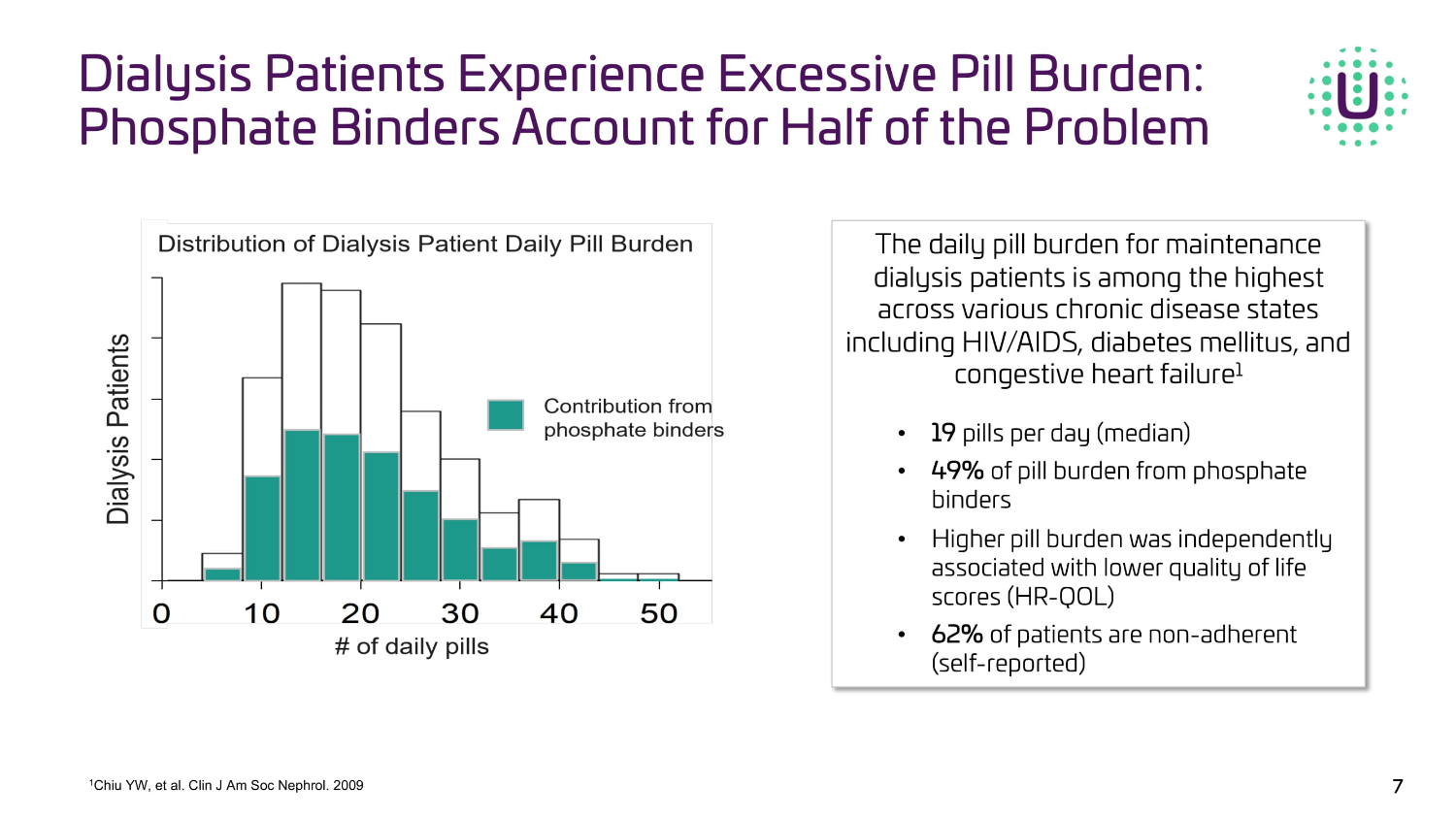 Dialysis Patients Experience Excessive Pill Burden: Phosphate Binders Account for Half of the Problem The daily pill burden for maintenance dialysis patients is among the highest across various chronic disease states including HIV/AIDS, diabetes mellitus, and congestive heart failure 1 • 19 pills per day (median) • 49% of pill burden from phosphate binders • Higher pill burden was independently associated with lower quality of life scores (HR - QOL) • 62% of patients are non - adherent (self - reported) 7 1 Chiu YW, et al. Clin J Am Soc Nephrol. 2009
