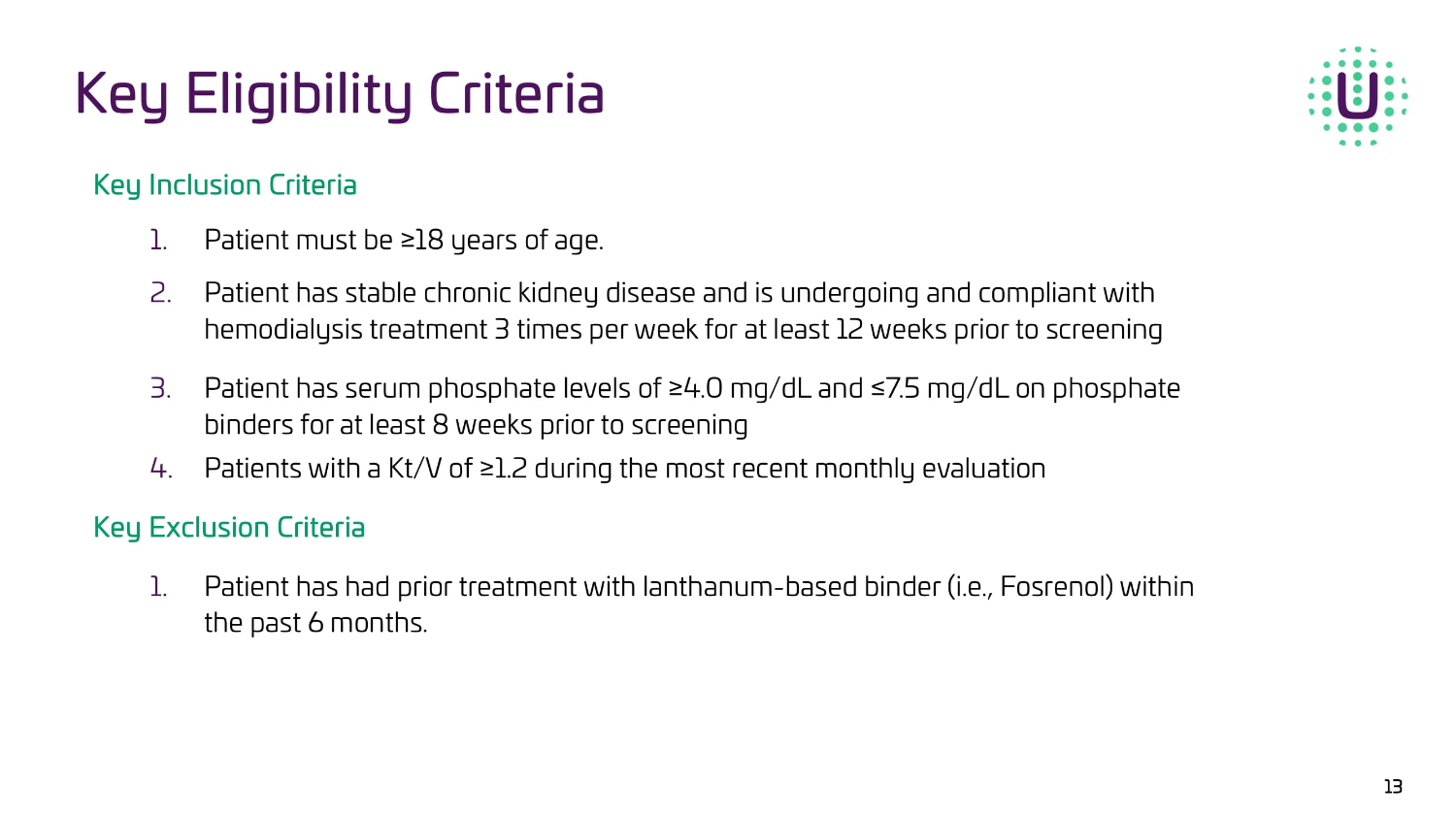 Key Inclusion Criteria 1. Patient must be ≥18 years of age. 2. Patient has stable chronic kidney disease and is undergoing and compliant with hemodialysis treatment 3 times per week for at least 12 weeks prior to screening 3. Patient has serum phosphate levels of ≥ 4.0 mg/dL and ≤7.5 mg/dL on phosphate binders fo r at least 8 weeks prior to screening 4. Patients with a Kt/V of ≥1.2 during the most recent monthly evaluation Key Exclusion Criteria 1. Patient has had prior treatment with lanthanum - based binder (i.e., Fosrenol) within the past 6 months. 13 Key Eligibility Criteria