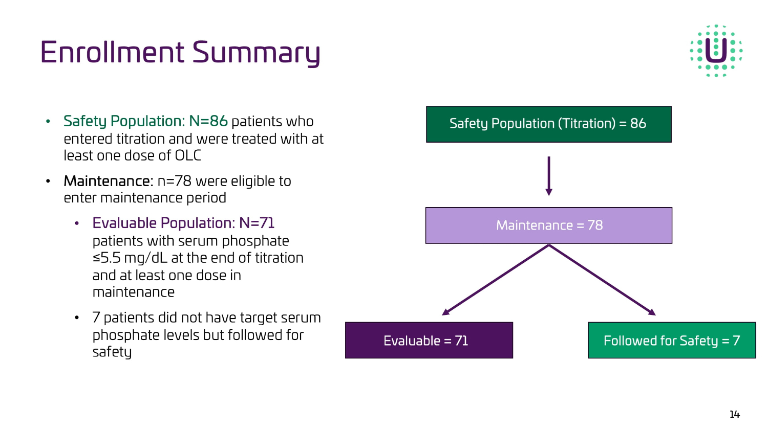 Enrollment Summary 14 ^ĂĨĞƚLJWŽƉƵůĂƚŝŽŶ͗Eс ϴϲ SDWLHQWVZKR HQWHUHGWLWUDWLRQDQGZHUHWUHDWHGZLWKDW OHDVWRQHGRVHRI2/& DĂŝŶƚĞŶĂŶĐĞ͗ Q ZHUHHOLJLEOHWRHQWHU PDLQWHQDQFHSHULRG ǀĂůƵĂďůĞWŽƉƵůĂƚŝŽŶ͗Eс ϳϭ SDWLHQWV ZLWKVHUXPSKRVSKDWH Ǫ PJG/DWWKHHQGRIWLWUDWLRQ DQGDWOHDVWRQHGRVHLQ PDLQWHQDQFH SDWLHQWVGLGQRWKDYHWDUJHWVHUXP SKRVSKDWHOHYHOVEXWIROORZHGIRU VDIHW\