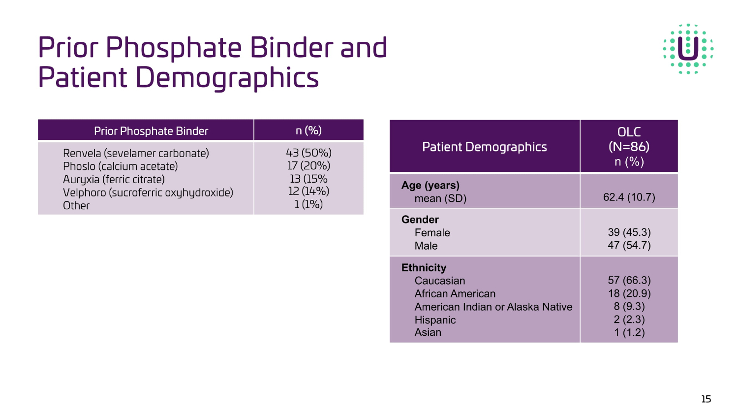 15 OLC (N=86) n (%) Patient Demographics 62.4 (10.7) Age (years) mean (SD) 39 (45.3) 47 (54.7) Gender Female Male 57 (66.3) 18 (20.9) 8 (9.3) 2 (2.3) 1 (1.2) Ethnicity Caucasian African American American Indian or Alaska Native Hispanic Asian Prior Phosphate Binder and Patient Demographics n (%) Prior Phosphate Binder 43 (50%) 17 (20%) 13 (15% 12 (14%) 1 (1%) Renvela (sevelamer carbonate) Phoslo (calcium acetate) Auryxia (ferric citrate) Velphoro (sucroferric oxyhydroxide) Other