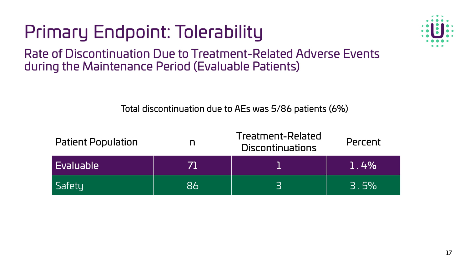 17 Rate of Discontinuation Due to Treatment - Related Adverse Events during the Maintenance Period (Evaluable Patients) Primary Endpoint: Tolerability Percent Treatment - Related Discontinuations n WĂƚŝĞŶƚWŽƉƵůĂƚŝŽŶ 1 . 4% 1 71 Evaluable 3 . 5% 3 86 Safety Total discontinuation due to AEs was 5/86 patients (6%)