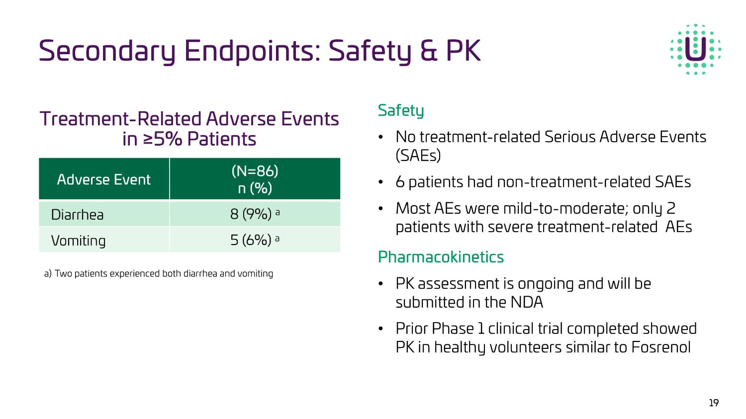 18 Primary Endpoint: Tolerability ● OLC - 201 is an open - label/non - comparator study design that was agreed upon with the FDA ● We believe that the low rate of OLC treatment - related discontinuations observed in this clinical trial compare favorably to the historical data that was submitted in the original Fosrenol NDA ○ Rate of discontinuations due to adverse events (treatment - related and non - treatment related) from Fosrenol Package Insert was 14% ○ OLC rate of discontinuations due to adverse events (treatment - related and non - treatment related) was 6% We believe that these results for OLC are sufficient to support the demonstration of similarity to Fosrenol with regard to tolerability required for our 505(b)(2) NDA filing