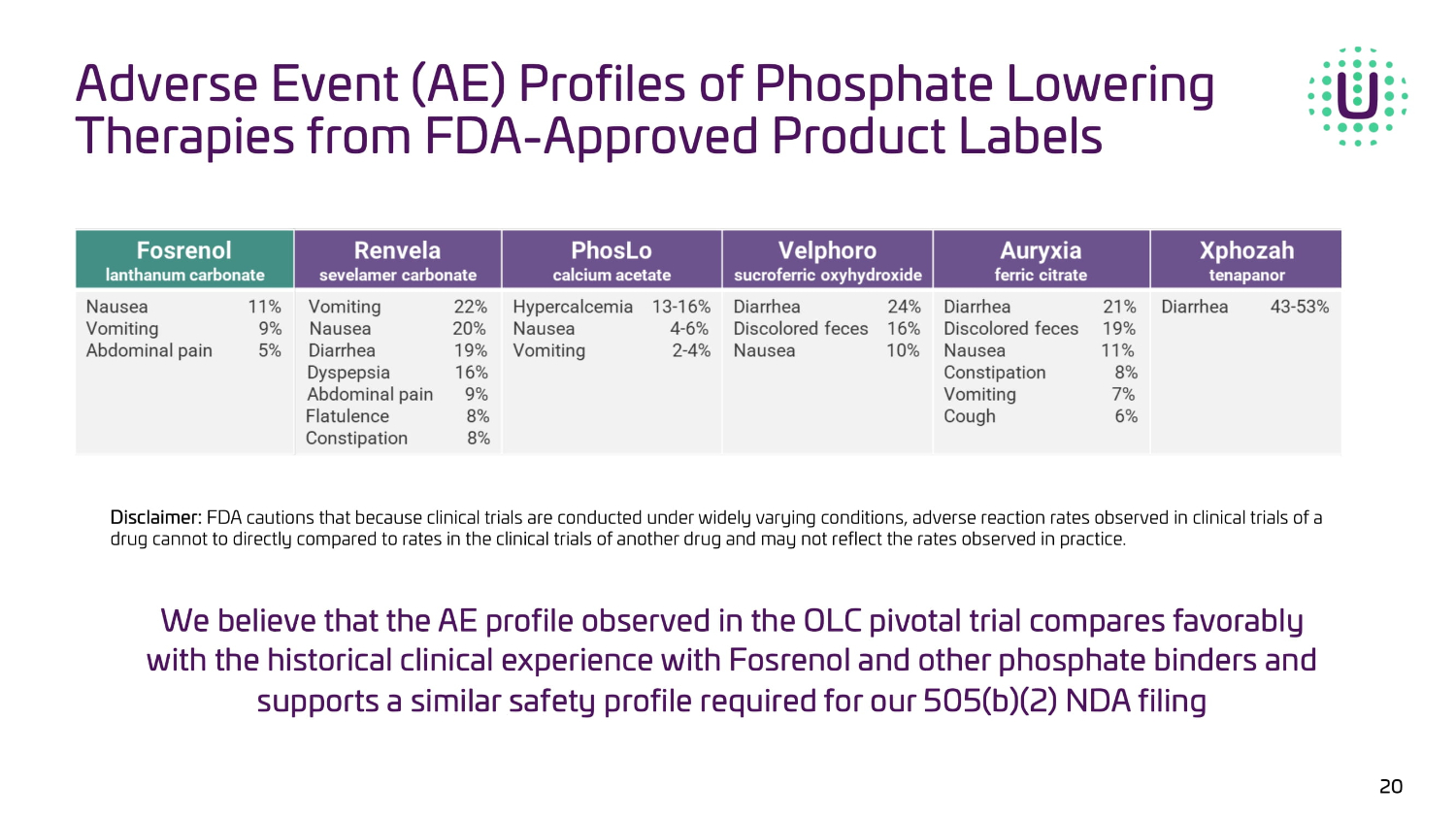 Adverse Event (AE) Profiles of Phosphate Lowering Therapies from FDA - Approved Product Labels Disclaimer: FDA cautions that because clinical trials are conducted under widely varying conditions, adverse reaction rates observed in c lin ical trials of a drug cannot to directly compared to rates in the clinical trials of another drug and may not reflect the rates observed in pr act ice. * 20 We believe that the AE profile observed in the OLC pivotal trial compares favorably with the historical clinical experience with Fosrenol and other phosphate binders and supports a similar safety profile required for our 505(b)(2) NDA filing