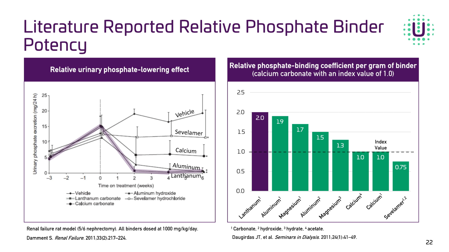 Relative phosphate - binding coefficient per gram of binder (calcium carbonate with an index value of 1.0) Relative urinary phosphate - lowering effect 2.0 1.9 1.7 1.5 1.3 1.0 1.0 0.75 0.0 0.5 1.0 1.5 2.0 2.5 Renal failure rat model (5/6 nephrectomy). All binders dosed at 1000 mg/kg/day. Index Value Damment S. Renal Failure. 2011;33(2):217 – 224. 1 Carbonate, 2 hydroxide, 3 hydrate, 4 acetate. Daugirdas JT, et al. Seminars in Dialysis . 2011;24(1):41 – 49. Lanthanum Literature Reported Relative Phosphate Binder Potency 22