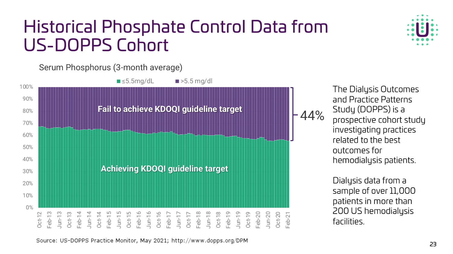0% 10% 20% 30% 40% 50% 60% 70% 80% 90% 100% Oct-12 Feb-13 Jun-13 Oct-13 Feb-14 Jun-14 Oct-14 Feb-15 Jun-15 Oct-15 Feb-16 Jun-16 Oct-16 Feb-17 Jun-17 Oct-17 Feb-18 Jun-18 Oct-18 Feb-19 Jun-19 Oct-19 Feb-20 Jun-20 Oct-20 Feb-21 ≤5.5mg/dL >5.5 mg/dl Serum Phosphorus (3 - month average) |||| || ||||||| ||||| ||||||||| |||||| 44% ||||||||| ||||| ||||||||| |||||| The Dialysis Outcomes and Practice Patterns Study (DOPPS) is a prospective cohort study investigating practices related to the best outcomes for hemodialysis patients. Dialysis data from a sample of over 11,000 patients in more than 200 US hemodialysis facilities. Historical Phosphate Control Data from US - DOPPS Cohort 23