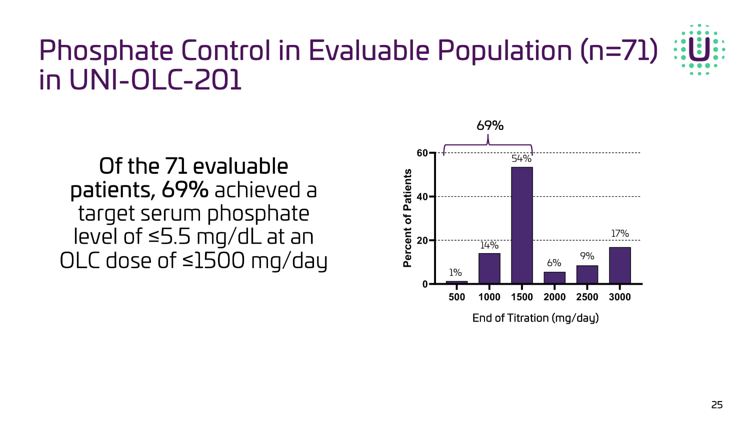 Phosphate Control in Safety Population (N=86) in UNI - OLC - 201 24 ≤5.5 mg/dL >5.5 mg/dL 59% 41% 10% 90% Baseline End of Titration 0 20 40 60 80 100 P e r c e n t o f P a t i e n t s Baseline - Serum phosphate levels at screening before washout End of Titration – includes last serum phosphate levels from all patients including those that discontinued during titration 77/ 86 (90%) / 9/86 (10%) Prior Phosphate Binder OLC Treatment