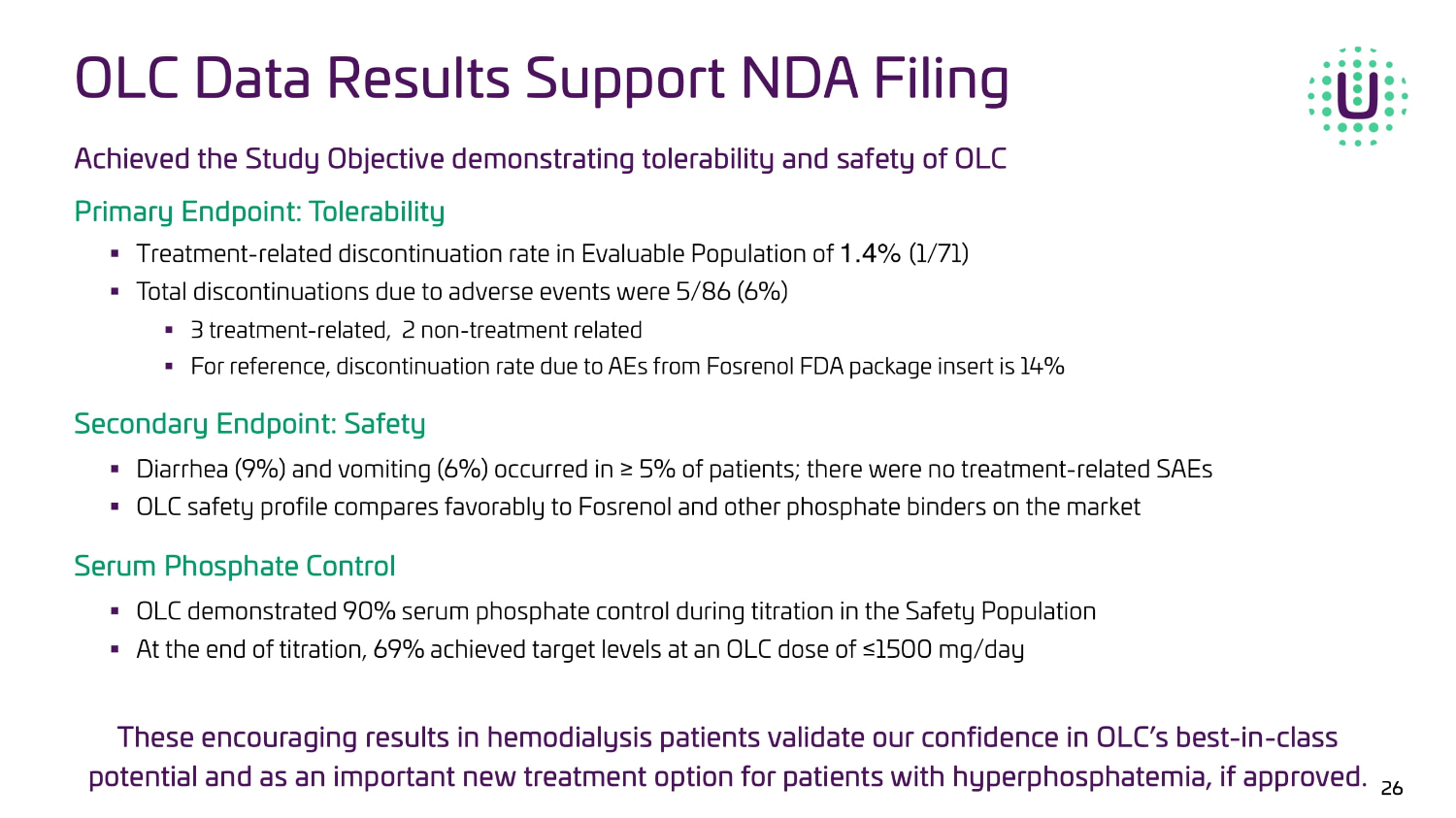 Of the 71 evaluable patients, 69% achieved a target serum phosphate level of ≤5.5 mg/dL at an OLC dose of ≤1500 mg/day 500 1000 1500 2000 2500 3000 0 20 40 60 Dose (mg/day) P e r c e n t o f P a t i e n t s 1% 14% 54% 6% 9% 17% End of Titration (mg/day) 69% 25 Phosphate Control in Evaluable Population (n=71) in UNI - OLC - 201