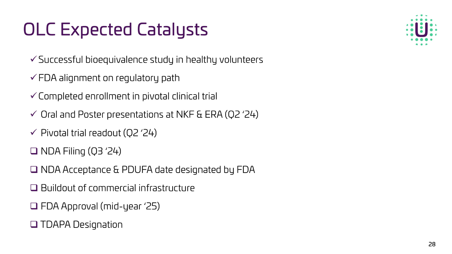 OLC Expected Catalysts x Successful bioequivalence study in healthy volunteers x FDA alignment on regulatory path x Completed enrollment in pivotal clinical trial x Oral and Poster presentations at NKF & ERA (Q2 ‘24) x Pivotal trial readout (Q2 ‘24) □ NDA Filing (Q3 ‘24) □ NDA Acceptance & PDUFA date designated by FDA □ Buildout of commercial infrastructure □ FDA Approval (mid - year ‘25) □ TDAPA Designation 28