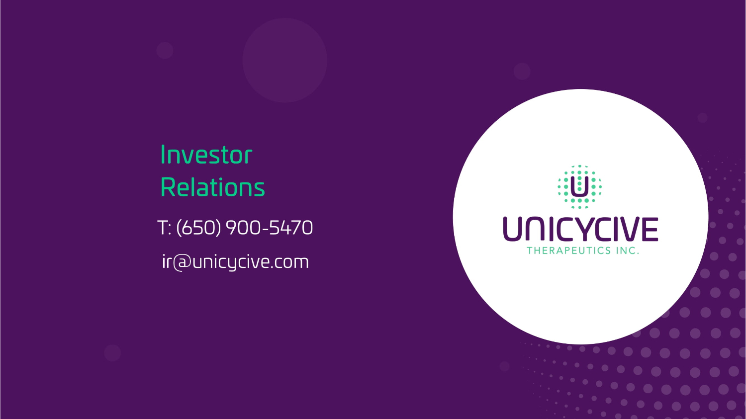T: (650) 900 - 5470 ir@unicycive.com Investor Relations